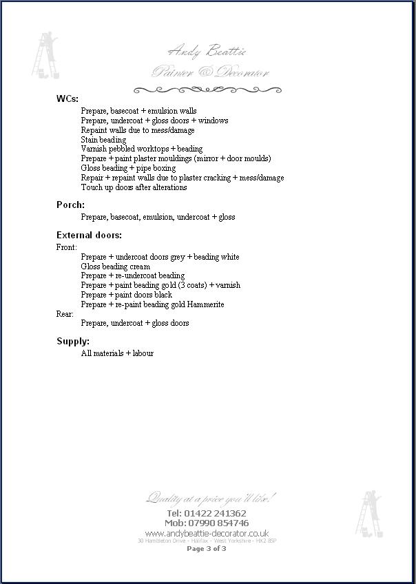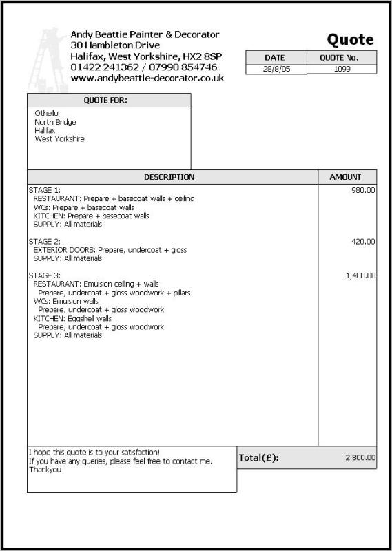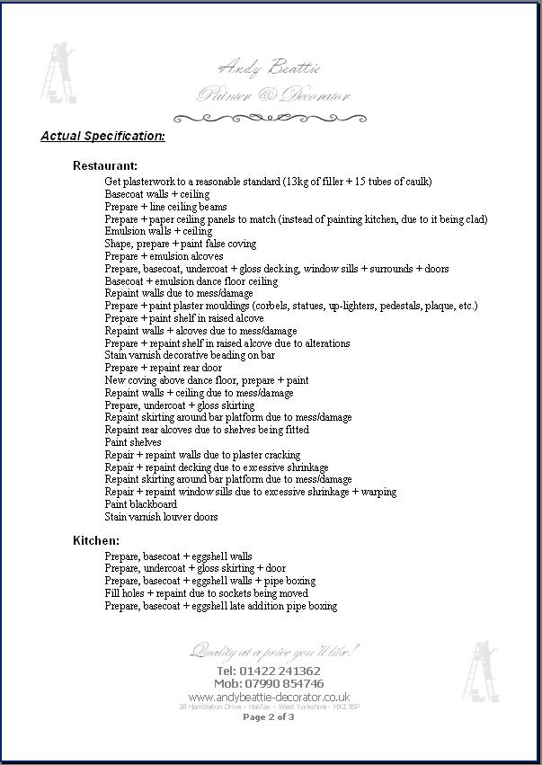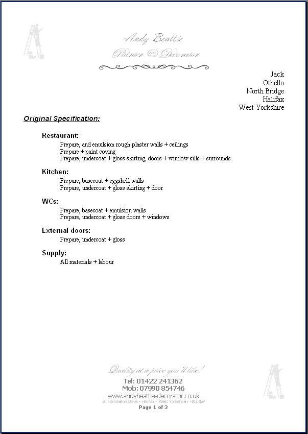 | Andy Beattie Painter & Decorator Othello, 91 Northgate, Halifax  This page is a warning to other tradesmen!   to be removed from this page fast?  Sunday, 28 August 2005 I went to the empty property that was to become Othello restaurant and met Jack Chiakli the owner, to price the work he required doing on the premises.   Monday, 17 October 2005 At 4:30PM, I returned to the property to meet with Jack Chiakli to discuss the work he required doing on the premises.  Wednesday, 28 December 2005 I received a telephone call asking that I be at the premises for a meeting regarding the work to be done. So I cancelled a Christmas arrangement that had been made weeks before. At 2:00PM, I went to the property, which was still an empty shell and had recently been plastered by a non-skilled plasterer (one of Jack Chiakli's relatives) and I was asked to start the work as soon as possible.  Friday, 30 December 2005 I started work on the un-ready project, and gave Jack Chiakli a breakdown of the work to be carried out, requesting that each section be paid within 7 days of completion. The original work was quoted for 20 days labour, I worked on the premises 58 days. Right up to the last day, whilst I was working on the project there was building, tiling, joinery, plumbing, glazing, and even the electrician chasing out channels in the newly painted plaster for sockets, light fittings, switches, and then moving them again because Jack Chiakli wanted them somewhere else, which I had to make good the damage done during installation. Whilst working on the project, we had several encounters with rats, and as I control pests as a pastime, I was asked to help control the problem, so I took a few traps, and caught numerous. Whilst working on this project I gave quotes to other customers Wednesday, 11 January 2006 | I gave 2 quotes | Thursday, 19 January 2006 | I gave 1 quote | Saturday, 21 January 2006 | I gave 2 quotes | Tuesday, 31 January 2006 | I gave 1 quote | Tuesday, 7 February 2006 | I gave 1 quote | Monday, 20 February 2006 | I gave 1 quote | Friday, 10 March 2006 | I gave 1 quote | I informed Jack Chiakli that I had other jobs to do, and he said that if I went to another job before his was finished, I was not to return, and I would not be paid. This caused me to lose customers, business and money.  Before the grand opening of the restaurant, Jack Chiakli had a private party, and caused damage to the painted walls (red wine and food) which I was asked to remedy. Jack Chiakli made a big song and dance about the grand opening, and said that people that had worked on the project would be invited. A few days before the grand opening, I was asked by 1 of the other tradesmen if I was attending the "invitation only" party, and had I returned my invitation stating I would be present at the party. This was news to me, as I hadn't even been given an invitation.  I have made numerous attempts to recover the amount outstanding since 24 March 2006, and have even informed Jack Chiakli that I may employ the services of a debt collector to recover the outstanding debt.  This project was supposed to last 1 month, but due to many alterations and additions to the project, by Jack Chiakli, who also run The Plaza, Halifax Bus Station, as it progressed it dragged on to become 3 months. The project was finally completed on 23 March 2006 and the invoice was submitted on 24 March 2006.  I started this project under the agreement that payment would be received within 7 days of completion. Payments I have received so far are: 14/01/06 | 500.00 GBP | | 02/02/06 | 500.00 GBP | | 22/02/06 | 500.00 GBP | | 06/04/06 | 1,000.00 GBP | this cheque bounced causing bank charges of 280.00 GBP | 28/07/06 | 280.00 GBP | | 1,020.00 GBP is still outstanding on my invoice for this project.  Here's a breakdown of the actual work I did   Wednesday, 7 March 2007 I employed the services of a debt collection agency to recover the outstanding invoiced amount.  Monday, 16 April 2007 I received an email from the debt collection agency, stating that Jack Chiakli had ignored the letters sent, and a personal visit will be the next step.  Monday, 14 May, 2007 I received an email from the debt collection agency "Once our visits were initiated, we received correspondence from the owner stating they disputed all monies which we are pursuing. All relevant information relating to the outstanding balance including a full breakdown of costs and interest incurred has now been provided."  My pastime is pest control, and whilst working on the restaurant, I was asked to help control the residents I removed many but nowhere near all of them  In the hands of a debt collection agency!  Businesses that also worked on this project: Alan Brown (Electrician) STILL NOT PAID? Stuart Hoyle (Plumber) GOT PAID EVENTUALLY! The Laminate Floor Man Ltd (building + flooring) GOT PAID EVENTUALLY! AFTER FILLING THE RESTAURANT WITH FRIENDS AND REFUSING TO PAY THE BILL   to be removed from this page fast?  Designed & updated by Andy Beattie |