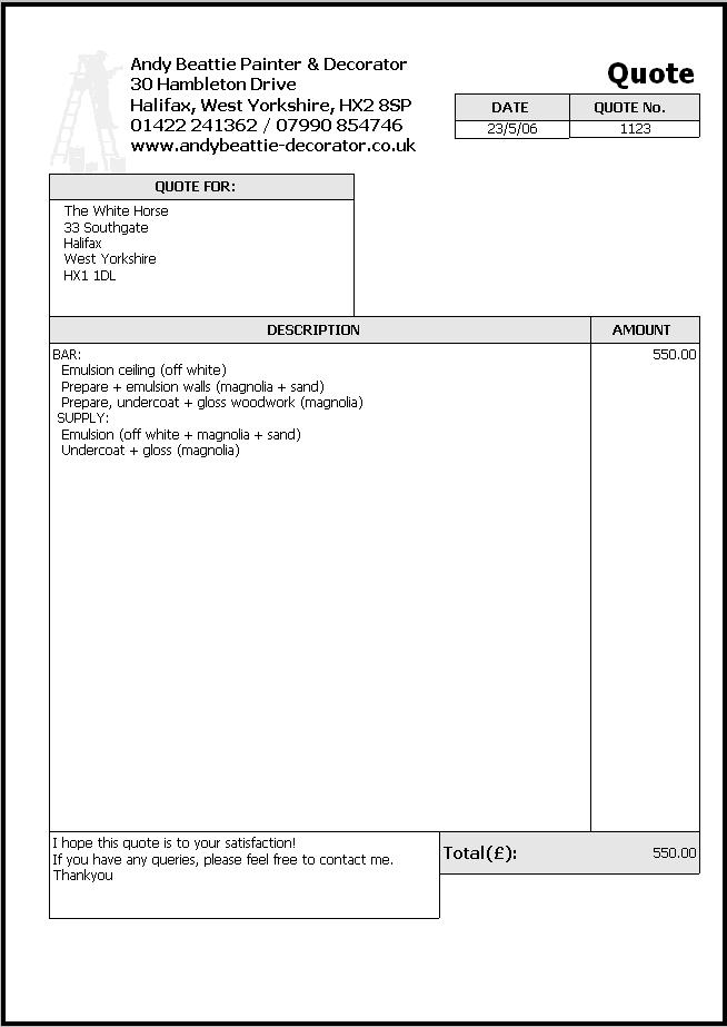 The claimant asks the court to enter judgement in their favour for 4802.30 GBP plus interest, totalling 5133.79 GBP. | All correspondence have been forwarded to my insurance company.  Monday, 14 May 2007 I received an email from the debt collection agency "our collectors have continued with their personal visits. Unfortunately, the response from the debtor has been minimal and we have received very little in the way of co-operation. Our legal dept. have recently forwarded the threat of default and blacklisting of the address and personal details."  Thursday, 31 May 2007 I received a letter from my insurance company stating that they had written to Mr. Luke Cook, the General Manager, on 22 August 2006, requesting details of their claim against me. To which they received no response, and Mr. Luke Cook, the General Manager, has made no formal claim against me. Yet on 24 April 2007, Mr. Luke Cook, the General Manager stated; "Despite the requests in previous correspondence, we have received none of the requested details or for that matter, any form of a response." I have responded to their claim against me, and am now in the process of suing Mr. Luke Cook, the General Manager, for breach of contract with a counter claim against him for; invoice + surcharges | 9,338.77 | debt collection fees | 350.00 | court fees | 250.00 | making a total of | 9,938.77 |  Friday, 7 June 2007 I received a Notice of Transfer of Proceedings to the Halifax County Court. Mr. Luke Cook, the General Manager, will also have received his today.  Monday, 25 June 2007 I arrived at the premises at 8:45AM to carry out the redecoration as was agreed as the yearly contract. There was no reply to my knocking on the door, yet lights were on inside. I left at 8:50AM, and have written a letter to Mr. Luke Cook, the General Manager, stating that his further breach of contract will also be pursued in court. And the work now reverts to the original pricing. Monday, 25 June 2007 Dear Mr. Cook, On Monday 25th June 2007, I attended your premises to commence work on the yearly contract as was agreed. As no-one was present to allow me access to fulfil the yearly contract, and as there has been no formal notice of cancellation, I shall be filing for breach of contract on this matter also. Due to the yearly contract being broken, I enclose your statement which now reverts back to the original quote, and includes all the extra work you added on, plus the weekly surcharges accumulated to date as was stated on the original invoice dated 29th June 2006. Yours sincerely Andrew Beattie Andy Beattie Painter & Decorator |  Saturday, 7 July 2007 I received a Notice of Directions Hearing to take place on 21 August 2007, at the Halifax County Court. Mr. Luke Cook, the General Manager, will also have received his today.  Tuesday, 21 August 2007 I attended the preliminary court hearing, at the Halifax County Court, as did Mr. Luke Cook, the General Manager and his business partner, Mr. Martin Walker. I was informed that I couldn't claim for the Debt Collection Agency fees, or the surcharges, as they weren't on the original contract. Mr. Luke Cook, the General Manager and his business partner, Mr. Martin Walker, were asked why they hadn't disputed my counterclaim for almost 10,000 GBP, they looked at each other and shrugged their shoulders, and were told "as they hadn't disputed it, they had accepted the claim against them and that they could be liable for the total claimed." We have been given 6 weeks to re-file, and if either claims has a mistake, the error will throw the case against them. Mr. Luke Cook, the General Manager and his business partner, Mr. Martin Walker, now have to re-calculate exactly what they are claiming against me, or they automatically lose the case and will be liable for all costs incurred.  Saturday, 8 September 2007 I received a General Form of Judgement Order I now have until 4:00PM on 24 September 2007 to fully quantify the counterclaim. Mr. Luke Cook, the General Manager and his business partner, Mr. Martin Walker, has until 4:00PM on 8 October 2007 to file a defence to the counterclaim. Both parties shall file and serve evidence from all witnesses on which they rely by 4:00PM on 22 October 2007. The court case is scheduled for the last week of April 2008.  Monday, 10 March 2008 The White Horse Inn has now closed! The premises are empty and UP TO LET This seems convenient with the court case scheduled for the last week of April 2008.   My invoice (which was reduced on the proviso of the yearly contract) of 989.87 GBP is STILL outstanding for this project, and as the yearly contract has been broken by the customer, it now reverts to the original of 1,069.87 GBP  In the hands of a debt collection agency!  to be removed from this page fast?  Designed & updated by Andy Beattie |